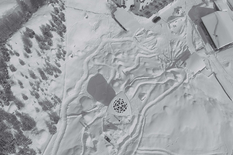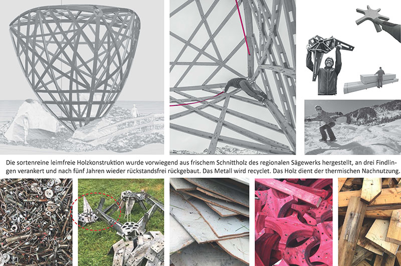 Im Gegensatz zum Neuschneelabor, dient die Holzskulptur im Sommer als Kletterwand für Bergwanderer. Im Winter wird in der Konstruktion mit verhältnismäßig deutlich weniger Wasser als bei Schneekanonen echter Pulverschnee produziert, wobei diese Technik erst in Entwicklung ist. Der Prototyp der der Neuschneewolke Lüsens hat erfolgreich 5 Jahre Wind und Wetter stand gehalten. Mein Büro ist für die Serienfertigung vorbereitet, sobald die Schneetechnik die nötige Effizienz erreicht hat. Für die Sportart Snowskate (Snoaboard ohne Bindung) reicht eine geringe Schneeschicht, um nachhaltig und freudevoll Wintersport betreiben zu können.
