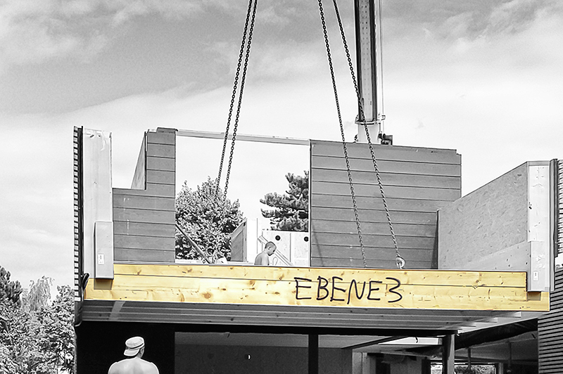 PS: The home-office of Dr. Proksch is on the split-level number 3 (see the photo), where the floor-panel was lifted in position after the walls, to use structural synergies and to optimize the assembling process.