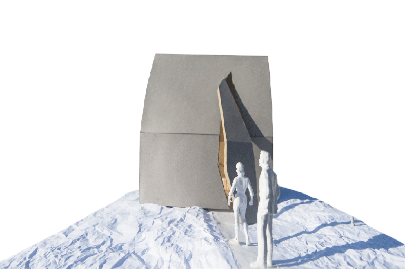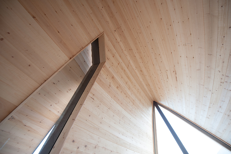 der fensterlosen Außenhülle in Lärchenschindel ist eine Art Scherbe als