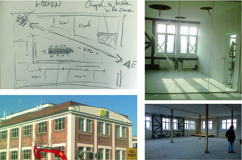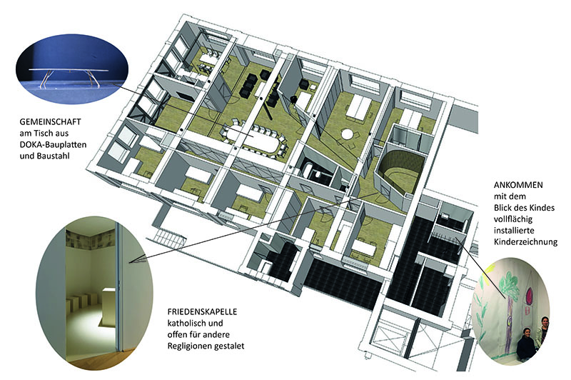 Eine leerstehende Kleinbahnfabrik in Wien wird für Wohnzwecke genutzt. Das gesamte Obergeschoß hat die österreiichische Fokolarbewegung gekauft, um es als Wohn- und Arbeitsraum jene 6 Männer zu nutzen, die für die Zone verantwortlich sind. Die dort lebenden Fokolare können auch als interreligiöse Klostergemeinschaft verstanden werden. Eine Willkommensblickachse reicht vom Eingang bis zur Küche, wo sich das Alltagsleben abspielt. Die Mitte bildet der große gemeinsame Tisch. Der einzige Raum ohne Fenster wird als katholische Friedenskapelle genutzt, die so gestaltet ist, dass sich auch Muslime, Juden und Budhisten wohl fühlen. Die Grafikarbeiten an den Wänden stammen aus der Feder von Georg Lebzelter. Die Kleinkinderzeichnungen im Eingangsbereich sind von meinen Kindern. Die Stahlsäulen und die aussteifende Stahlkonstruktion der Wand werden sandgestrahlt und bleiben auf Sicht. Fotos vom gesamten Innenraum folgen noch.
