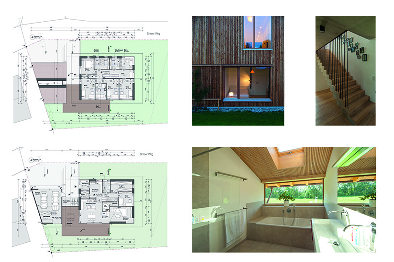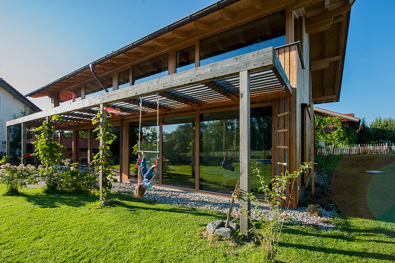 Dieses Haus schließt in Stephanskirchen bei Rosenheim den Siedlungsraum gegenüber der Bahnstrecke ab. Auf meine Beratung hin verzichtete das Ehepaar auf den Bau eines Kellers, um Material und Geld zu sparen und um die Umwelt zu schonen. An der großzügig verglasten Südfassade schützen ein Vordach und eine Pergola im Sommer vor Überhitzung. Für mich als Architekt war und ist es besonders erfreulich, dass die Familie ein sehr gutes Gespür für Gestaltung hat und sich im Haus im Alltag wohlfühlt. Wenn Dialog gelingt, kann der Planer auch nach viele Jahren ohne Voranmeldung vorbeikommen und sich über Funktion und Gestaltung freuen.