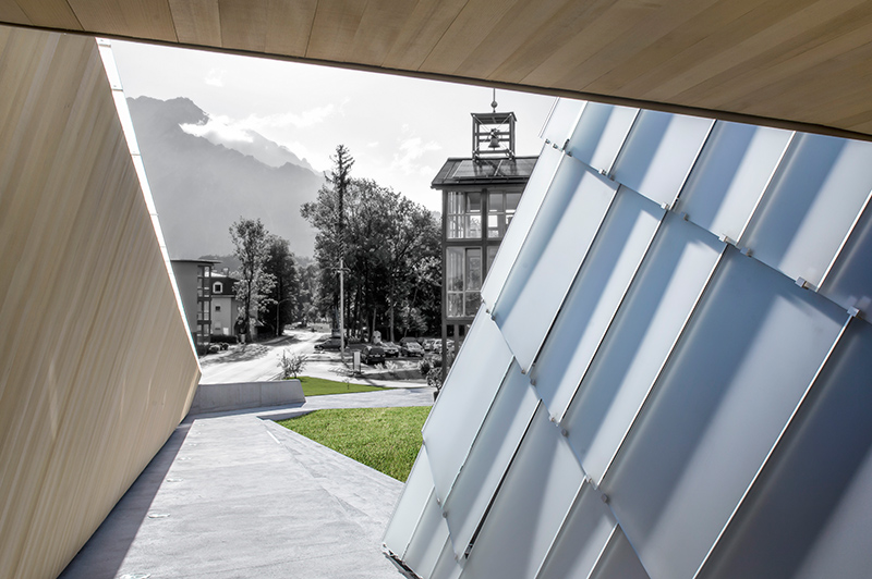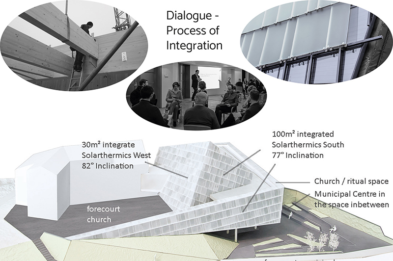 The public building church and municipal centre Rif in Salzburg is a case study for solar integrated self-sufficient design, where urban issues, space allocation plan and energetically functions have been solved simultaneously. The solar issue was the main relevant boundary condition for the form-finding of the architecture, whereas the appearance of the building does not attract the attention to solar energy but to a useable sculpture.