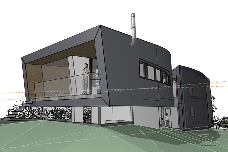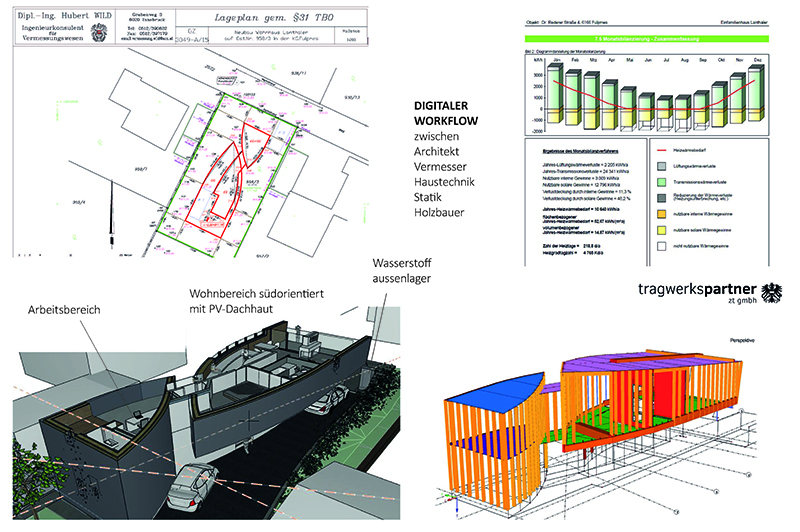 Der Bauherr will am Grundstück der Eltern nachverdichten, wohnen und arbeiten verbinden und energieautark leben. Überschüssige Energie des PV-Daches wird im Sommer in Form von Wasserstoff gespeichert und im Winter für Warmwasser und zum Betreiben der Flächenheizung verwendet. Dies ist in Tirol die erste Referenz für dieses womöglich sehr zukunftsträchtige Energiekonzepte.
