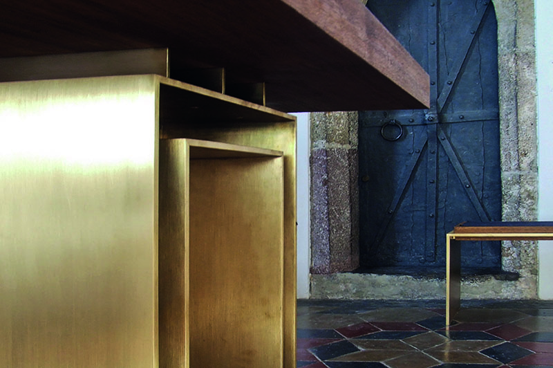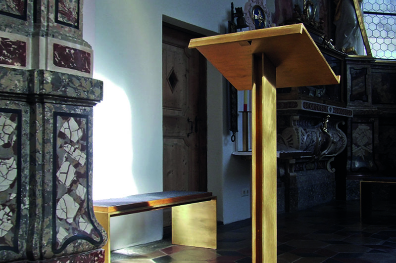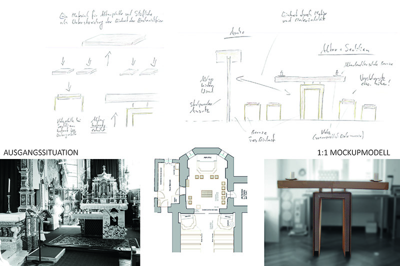 Der Entwurf hat bei einem geladenen Wettbewerb der Diözese Innsbruck überzeugt, da wochentags oder bei kleinen Taufen eine kleine Gemeinschaft rund um den Altar im Altarraum sitzen und feiern kann. Der neue runde Tische des Herrn sowie auch der Tisch des Brotes, also der Ambo können von beiden Seiten genutzt werden. Daher wird auch als erstes das Bild der selbst entworfenen Bestuhlung gezeigt, die in der Runde angeordnet im Sinne der Gemeinschaftsbildung  ebenso wichtig ist, wie der Altar. Der Stein wurde in auf Basis des bestehenden Bodenmaterials im Steinbruch gesucht und gefunden.
