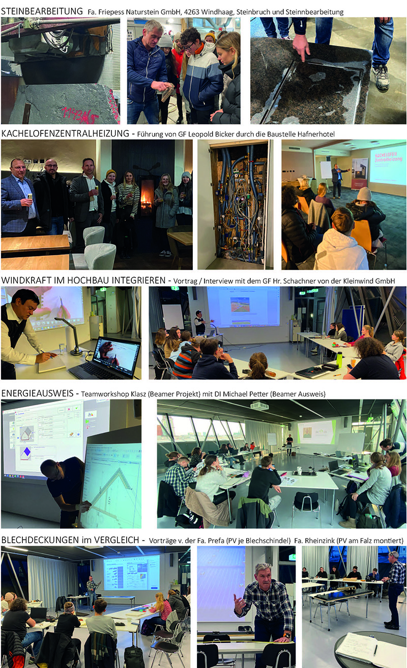- EXKURSIONEN zu FACHFIRMEN bzw. WORKSHOPS und DISKUSSIONEN mit Fachleuten im Hörsaal / Eindrücke: