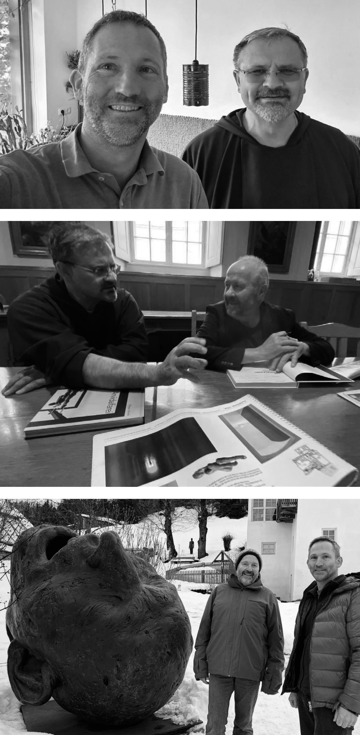 Foto 2: Im Wettbewerbsentwurf hat Klasz eine von Lois Anfidalfarei sich in Arbeit befindliche Skulptur am Ende der Wegführung im Klostergarten über der Kaisergruft vorgeschlagen. Das Foto entstand im Zuge einer Besprechung von Lois, Marek und mir im Kloster.